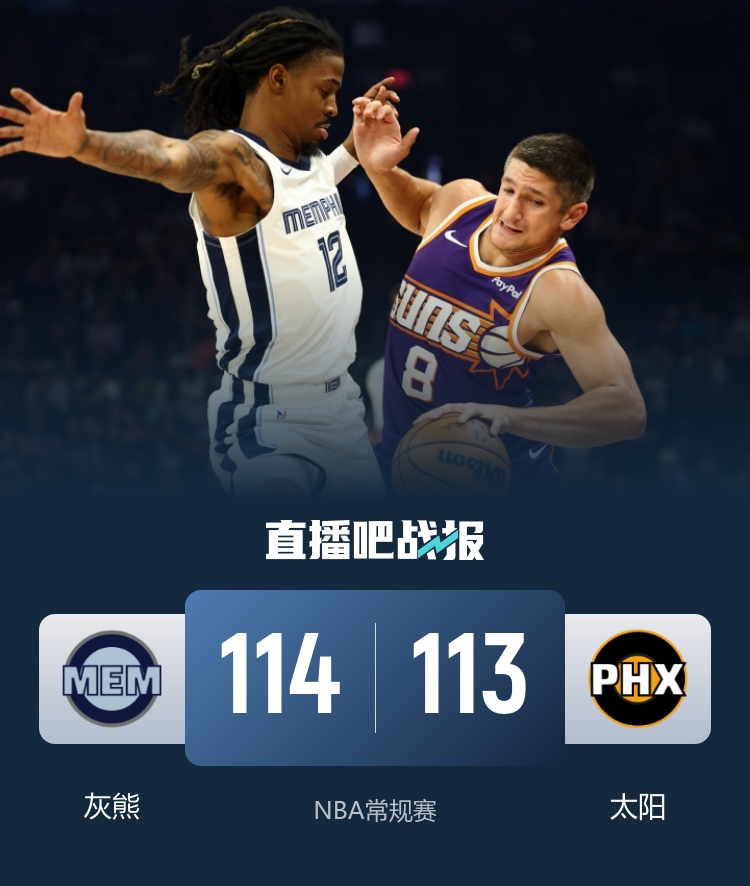 此役一上来两队迅速找到节奏,莫兰特手感滚烫连续取分,太阳内外结合一度占优,末段灰熊多点开花后来居上,首节结束时灰熊领先1分,次节回来,两队进攻火力放缓,吉莱斯皮突然爆发单节狂揽13分,半场战罢,太阳反超4分。短暂休整后布克突然发力独得13分,但灰熊及时复苏稳住局势,三节结束后灰熊依然领先3分,末节决战,双方鏖战至最后时刻,马威暴扣助队反超,莫兰特大心脏跳投再度反超,布克超远三分未果,最终灰熊114-113险胜送太阳4连败。
